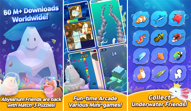 Wemade Play Co., Ltd. has officially launched the puzzle game Abyssrium Match on the global App Store and Google Play. Building on the success of the "Abyssrium" IP, which has been downloaded over 60 million times worldwide, the game not only retains the beloved characters and soothing gameplay of the original, but also adds three-match puzzles and dress up elements.