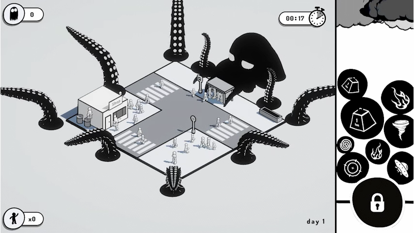 You are a newly-born deity. Your goal: strike down non-believers to grow your legion of faithful followers. Unlock deadly powers - from summoning tornadoes and hellfire to calling in UFOs or a T-Rex that shoots eye beams - to harvest souls and become the ultimate Almighty God.