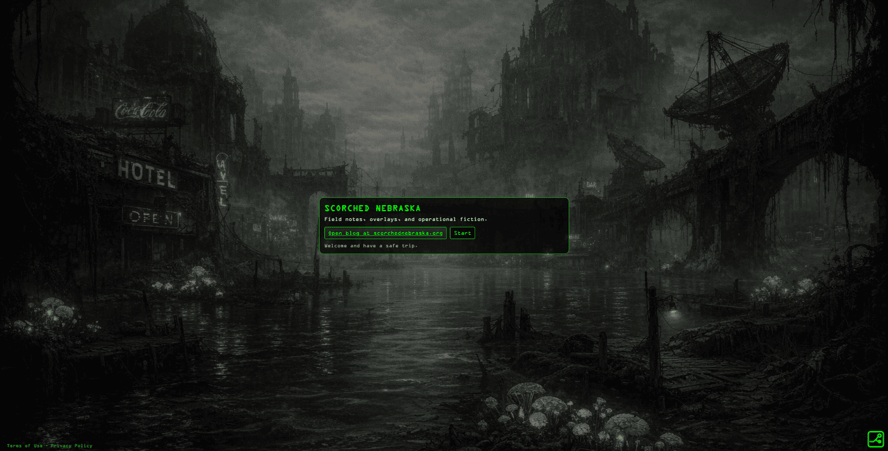 Scorched Nebraska is a "post-post-apocalyptic" MMO centered on "information competition" where players reshape the world by deciphering geographical clues across a post-apocalyptic wasteland.